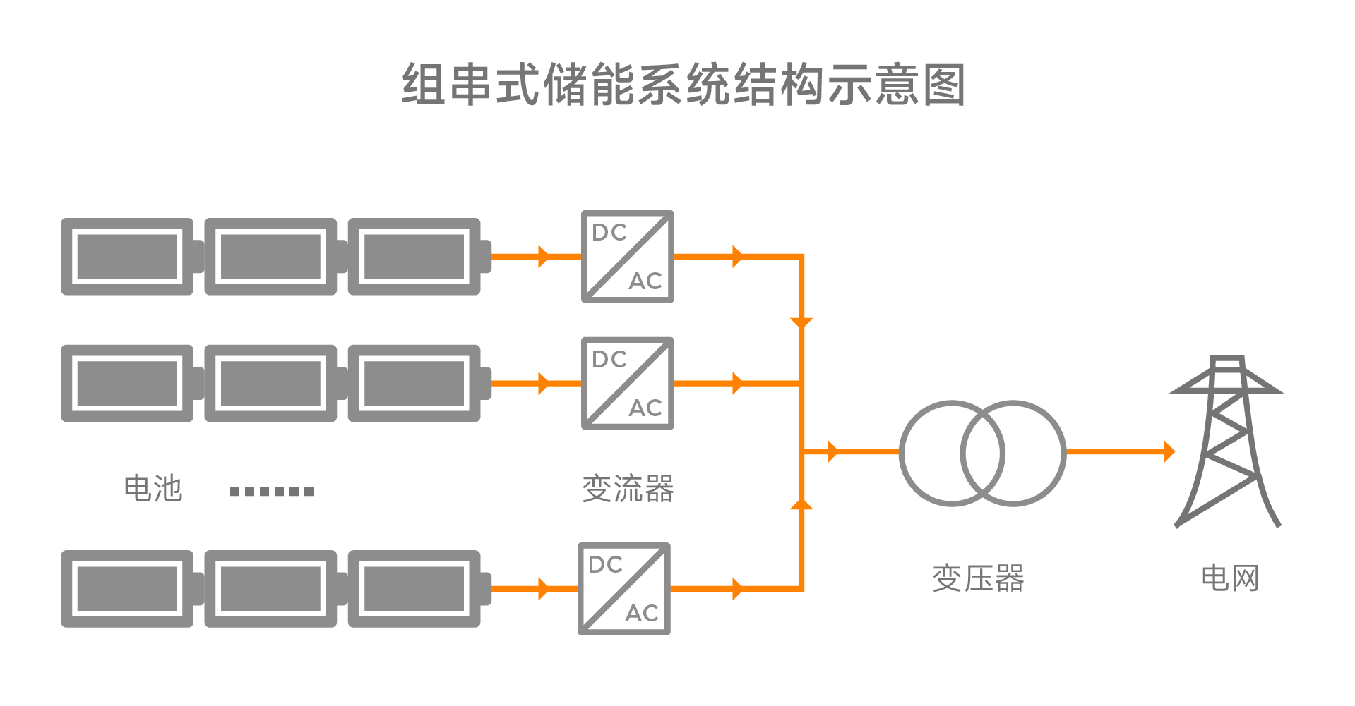 組串式儲(chǔ)能一般采用模塊化設(shè)計(jì),設(shè)備選用智能組串式儲(chǔ)能一體柜,單柜設(shè)備體積小,由多個(gè)儲(chǔ)能一體柜組成一個(gè)儲(chǔ)能子系統(tǒng),多個(gè)子系統(tǒng)組成組串式儲(chǔ)能系統(tǒng)。其系統(tǒng)結(jié)構(gòu)為Pack電池間串聯(lián)組成電池簇,單個(gè)電池簇(即一臺(tái)儲(chǔ)能一體柜內(nèi)電池)接一臺(tái)儲(chǔ)能變流器(集成于儲(chǔ)能一體柜內(nèi))轉(zhuǎn)換成交流電,多臺(tái)儲(chǔ)能一體柜并聯(lián)經(jīng)交流匯流后,接入變壓器升壓接入電網(wǎng)。