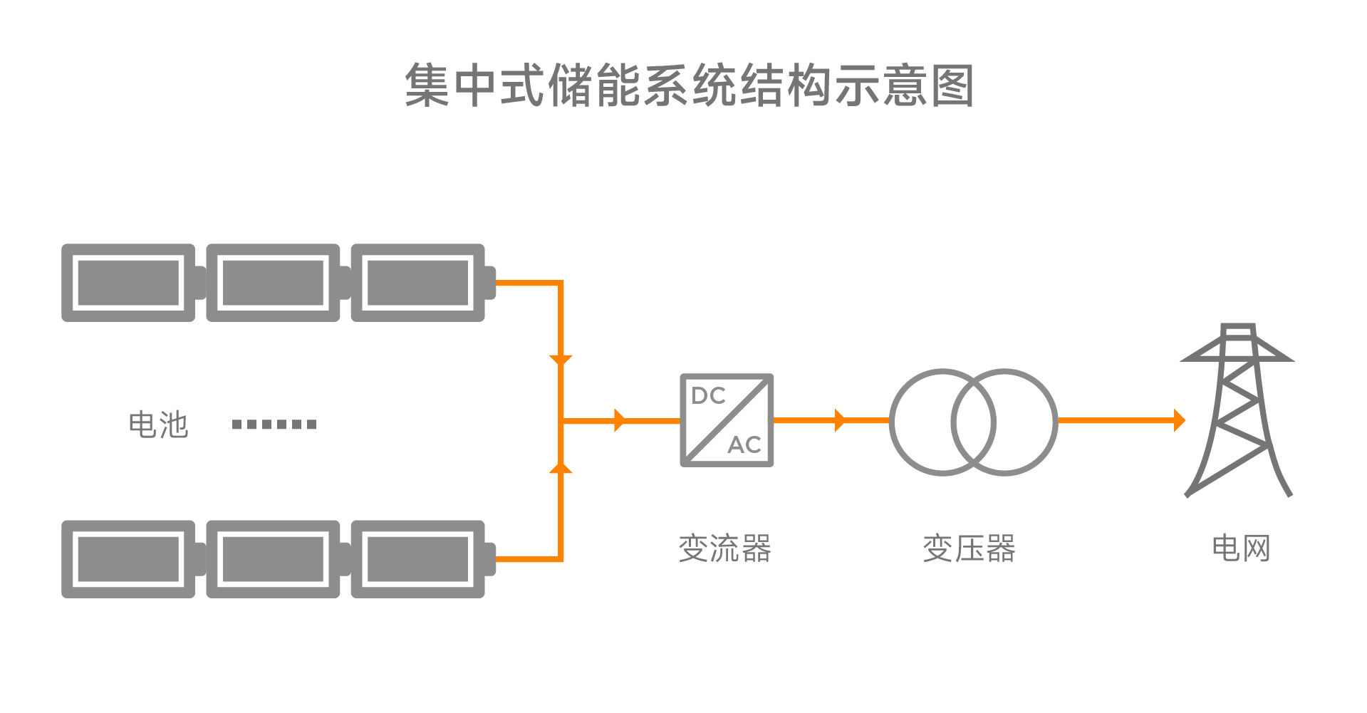 集中式儲(chǔ)能通常單臺(tái)設(shè)備容量大、體積大,采用集裝箱式裝配方式。其系統(tǒng)結(jié)構(gòu)為Pack電池串聯(lián)組成電池簇,多個(gè)電池簇在直流側(cè)并聯(lián),匯入一個(gè)儲(chǔ)能變流器轉(zhuǎn)換成交流電,再經(jīng)由變壓器升壓后接入電網(wǎng)。