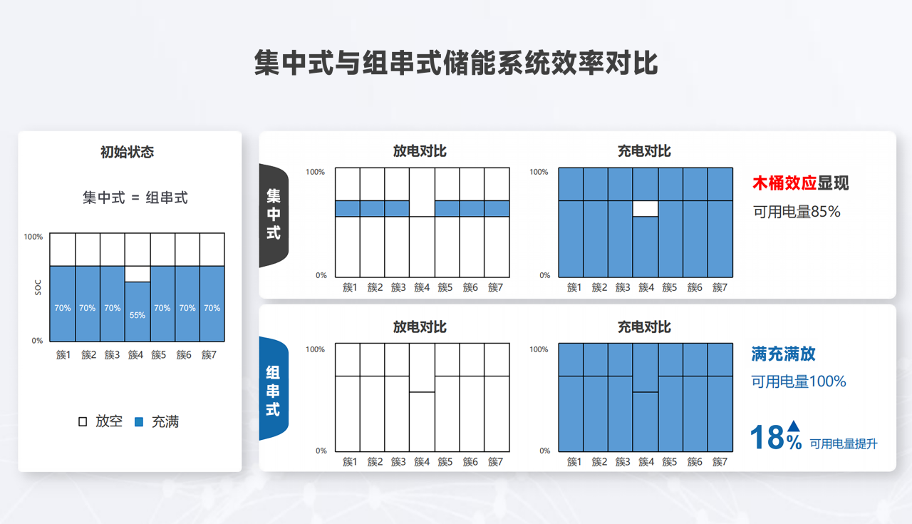 集中式儲(chǔ)能系統(tǒng)直流側(cè)多簇并聯(lián),長期運(yùn)行會(huì)出現(xiàn)簇間內(nèi)阻差異愈發(fā)明顯的情況,導(dǎo)致簇間環(huán)流,引起發(fā)熱、電池老化加速,此時(shí)木桶效應(yīng)顯現(xiàn);簇間不一致性導(dǎo)致系統(tǒng)整體性能受性能最低簇的制約,單簇容量衰減影響整柜性能,而且隨著時(shí)間推移,后期愈發(fā)明顯,造成系統(tǒng)循環(huán)壽命降低,全生命周期充放電量及收益大受影響。